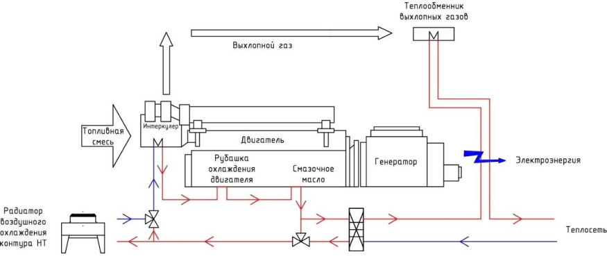 Двигун має два контури охолодження: високотемпературний (HT) та низькотемпературний (LT). У HT-контур включаються «сорочка охолодження» двигуна, теплообмінник охолодження олії, 1-й ступінь охолодження газоповітряної суміші. Тепло охолоджуючої рідини (ОЖ) HT-контуру утилізується за допомогою пластинчастого теплообмінника у зовнішню теплову мережу та йде споживачам. За відсутності відбору тепла у зовнішню мережу тепло розсіюється в атмосферу через радіатор повітряного охолодження («суху градирню»).